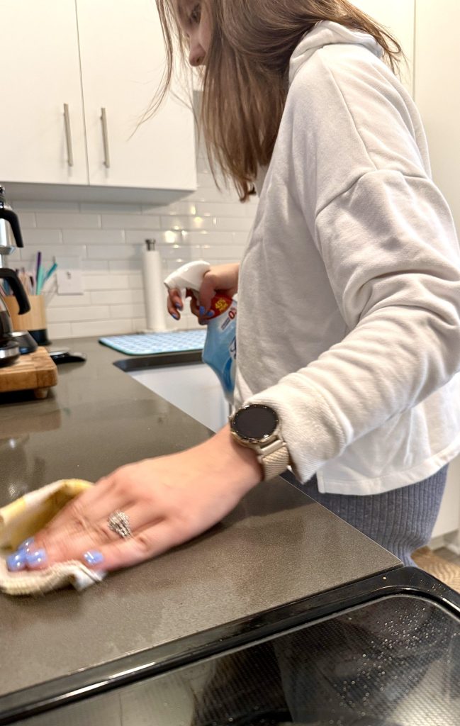 Then it’s time for surfaces: Don’t forget to dust and clean less obvious surfaces like ceiling fans, baseboards and door frames too!! And then grab your preferred general cleaner and a reusable cleaning rag and get to wiping down your main surfaces like in the kitchen and bathrooms.