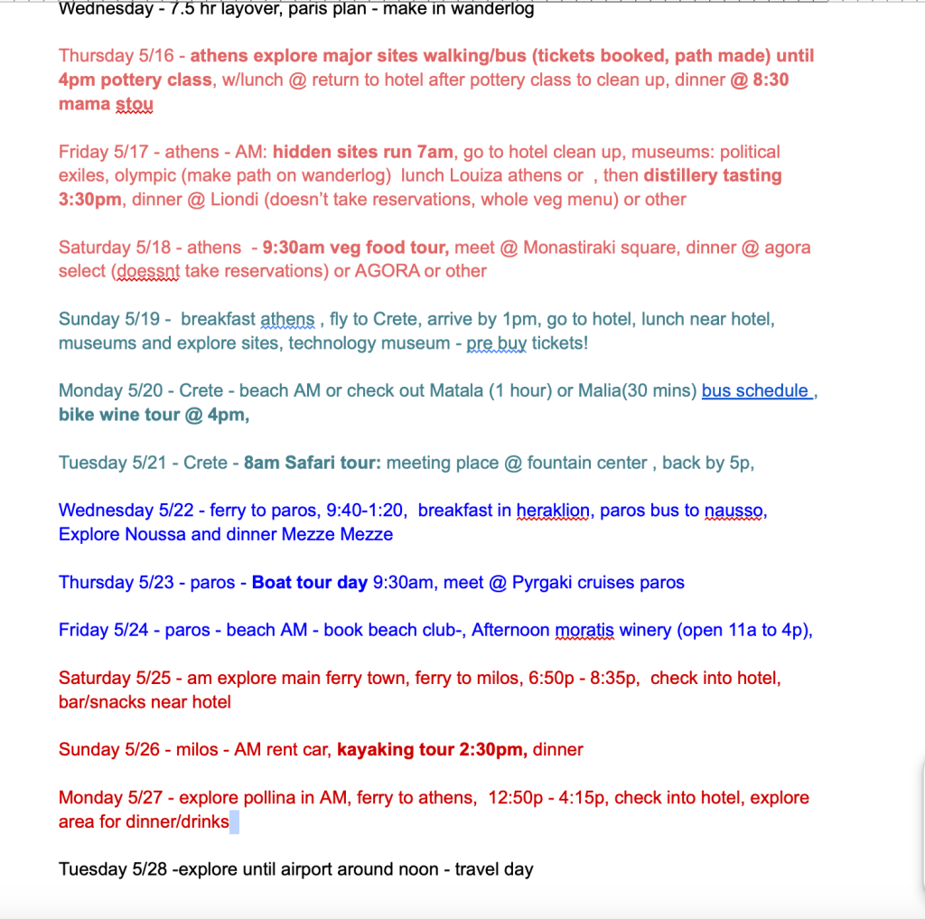 Also if you need evidence of my love of trip planning here’s an itinerary screen shot from our last big trip-